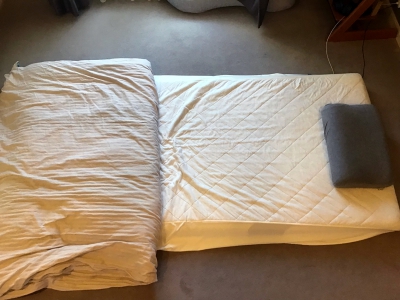 寝る時に使うもの。寝具。かけ布団、敷き布団がある。敷き布団は柔らかすぎると寝る時に腰に負担がかかりやすい。