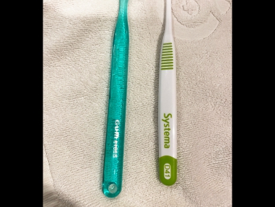 歯ブラシの手で持つところ。柄が細いものや太いものがある。持ちやすいものがよい。