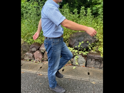 またぐ。片麻痺の人が溝をまたぐ時は、➀杖 ➁患側の足 ➂健側の足の順にまたぐ。