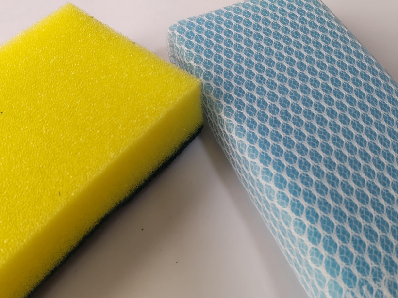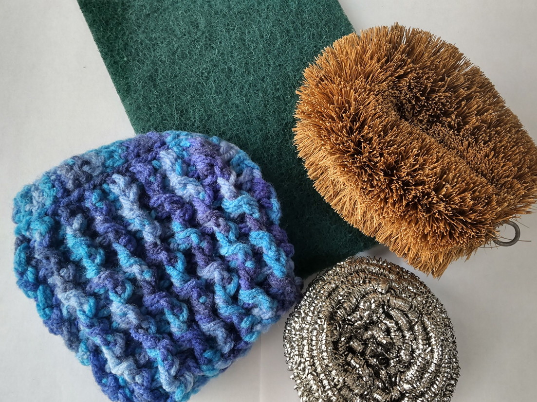 食器などを洗うたわし。ナイロンたわしは硬くて汚れが落ちやすいが、傷つきやすいものは洗わない。
